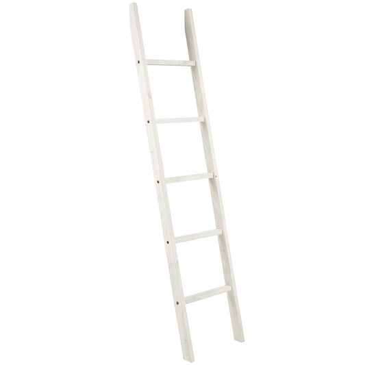 The wall-leaning white distressed wood ladder rack is made from solid pine wood sourced from renewable resources, and it is perfect for storing towels in your bathroom, kitchen, or laundry room.