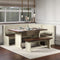 - Wood seats and top feature an intentionally distressed, worn look with natural imperfections, designed for a rustic style.