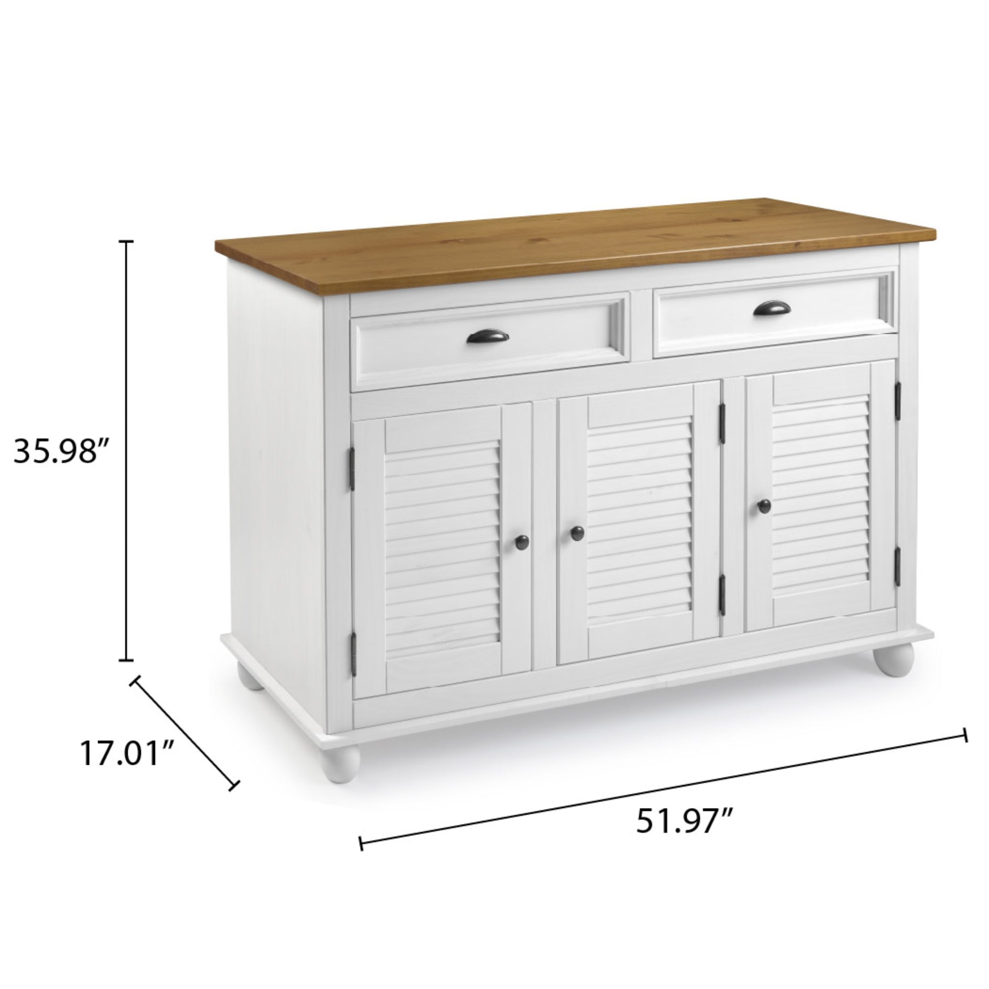 - Finish & Hardware: White wash color stain with black metal handles and hinges.