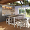 - Wood tops and seats feature an intentionally distressed, worn look with natural imperfections, designed for a rustic style.