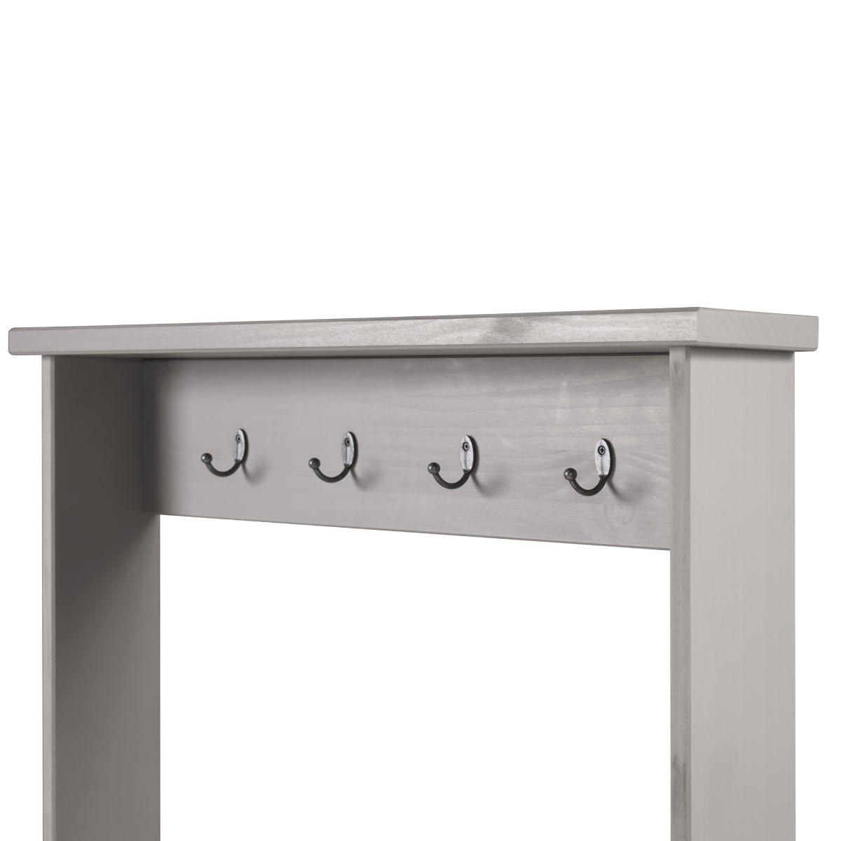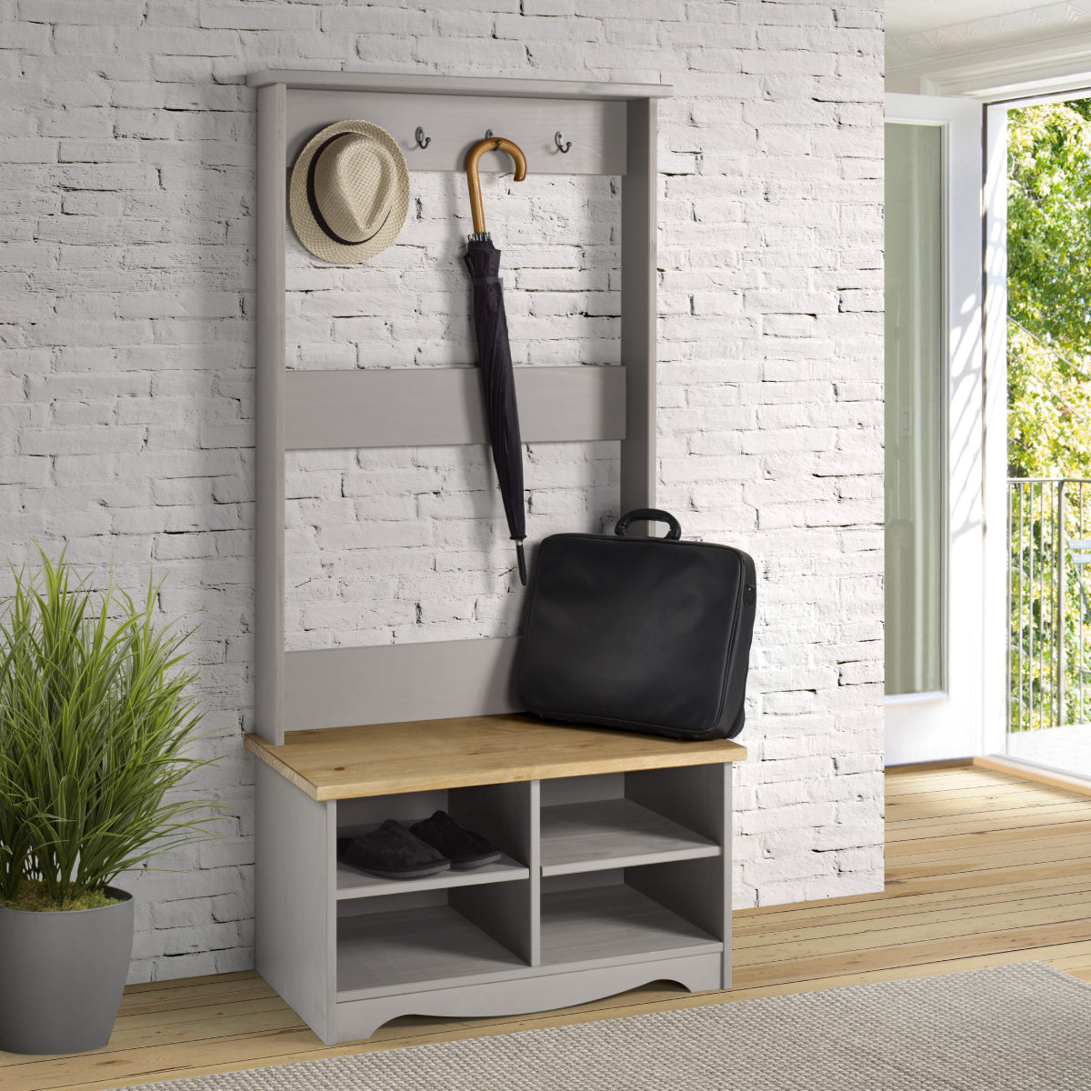 Crafted from high-quality pine wood, this hall tree organizer in gray wash color is a versatile touch for your entryway, it gives you storage and a handy seat all at once. Once you have one of these, you can't live without it anymore.